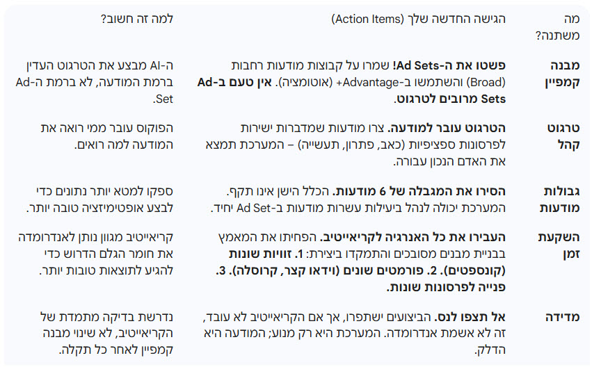 לסיכום: המיקוד שלכם צריך להיות בקריאייטיב אסטרטגי עמוק ומגוון, כאשר את שאר העבודה, בעיקר את בחירת הקהל, אתם מעבירים לידי האוטומציה של מטא.