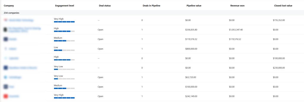 וככה נראה דוח החברות אחרי שבוחרים להציגו עם עמודת REVENUE – שימו לב שהוא מציג את נתוני השנה האחרונה מסיילספורס, אולם רק עבור החברות להן הוצגו מודעות השנה בחשבון הפרסום: