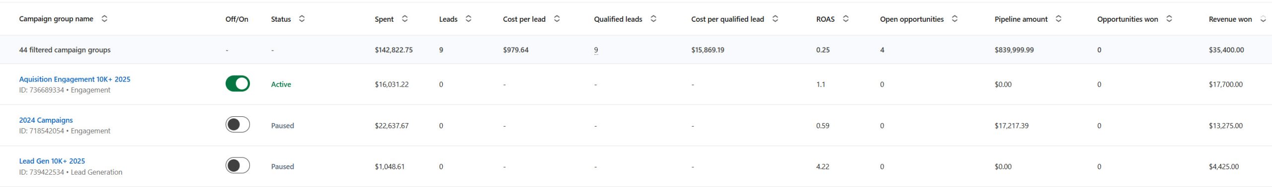 ככה נראה ממשק הקמפיינים אחרי בחירת סט עמודות pipeline: