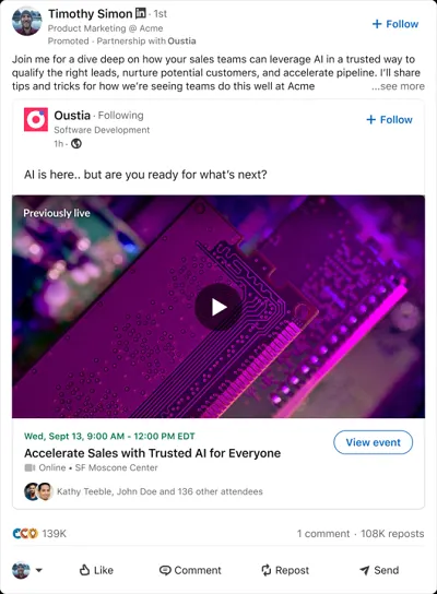 לינקדאין מוסיפה אלמנט נוסף למודעות Thought Leader שלה, כאשר עסקים יכולים כעת גם לתת חסות לפוסטים של כל חבר הכוללים קישור לאירוע בלינקדאין.