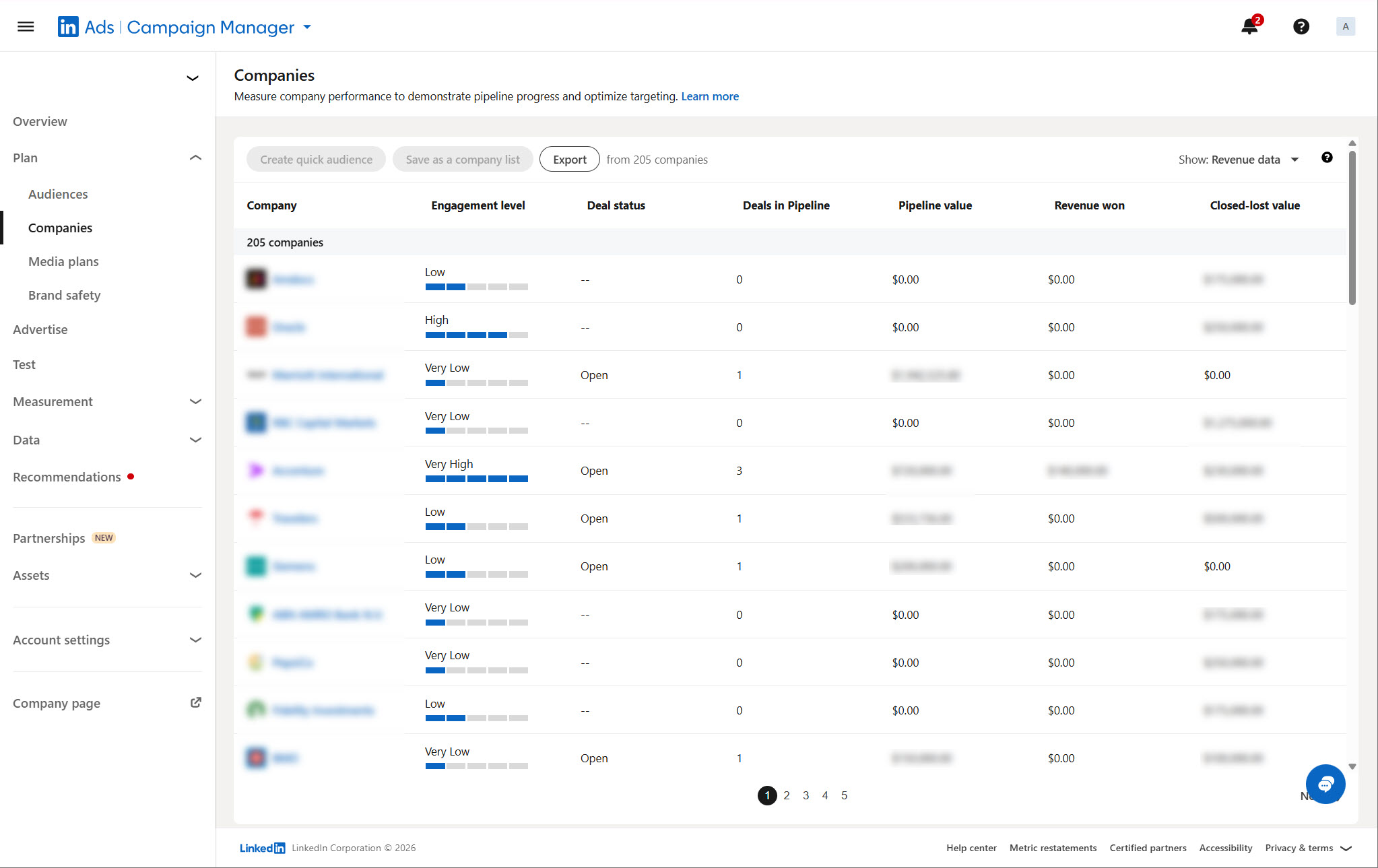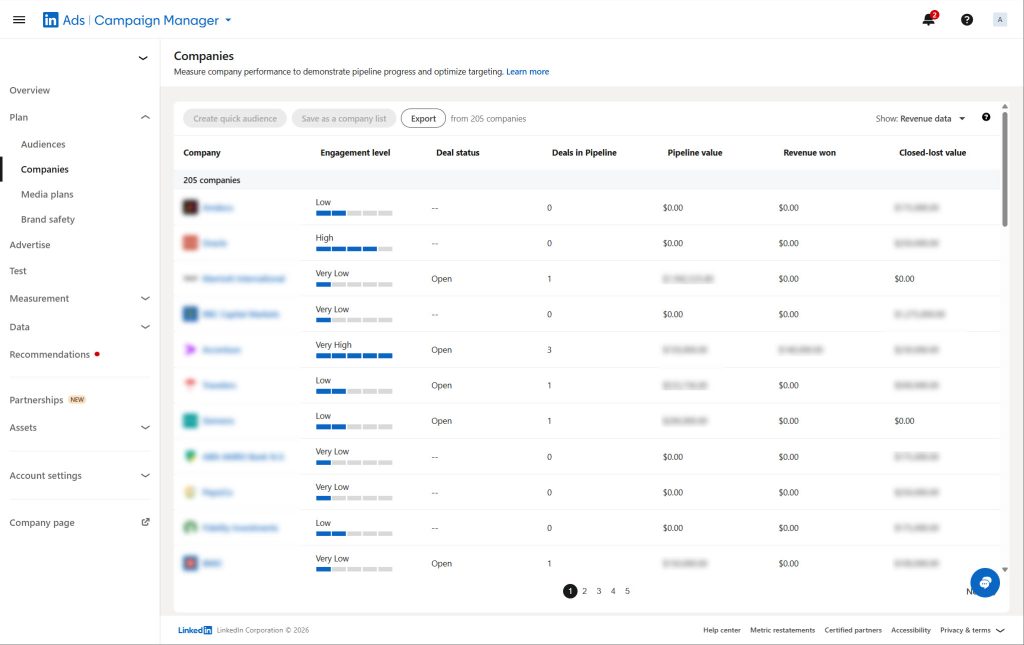 המידע החדש של "הכנסות" בלשונית החברות עוזרים לך לקשר בין רמת האנגייגמנט של החברה לpipeline ולעסקאות שנסגרו בהצלחה (closed-won deals), ובכך מספקים לך נראות ברורה יותר לגבי ההשפעה העסקית של הפרסום.