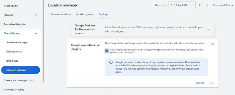בספרייה המשותפת (Shared Library) תחת מנהל המיקומים (Location Manager), גוגל אדס כוללת כעת אפשרות הנקראת "נתוני מיקום בבעלות גוגל" (Google Owned Location Data). כאשר היא מופעלת, גוגל יכולה למשוך באופן אוטומטי תמונות מהספרייה שלה ולהשתמש בהם במודעות הקשורות למיקומי העסק שלכם.