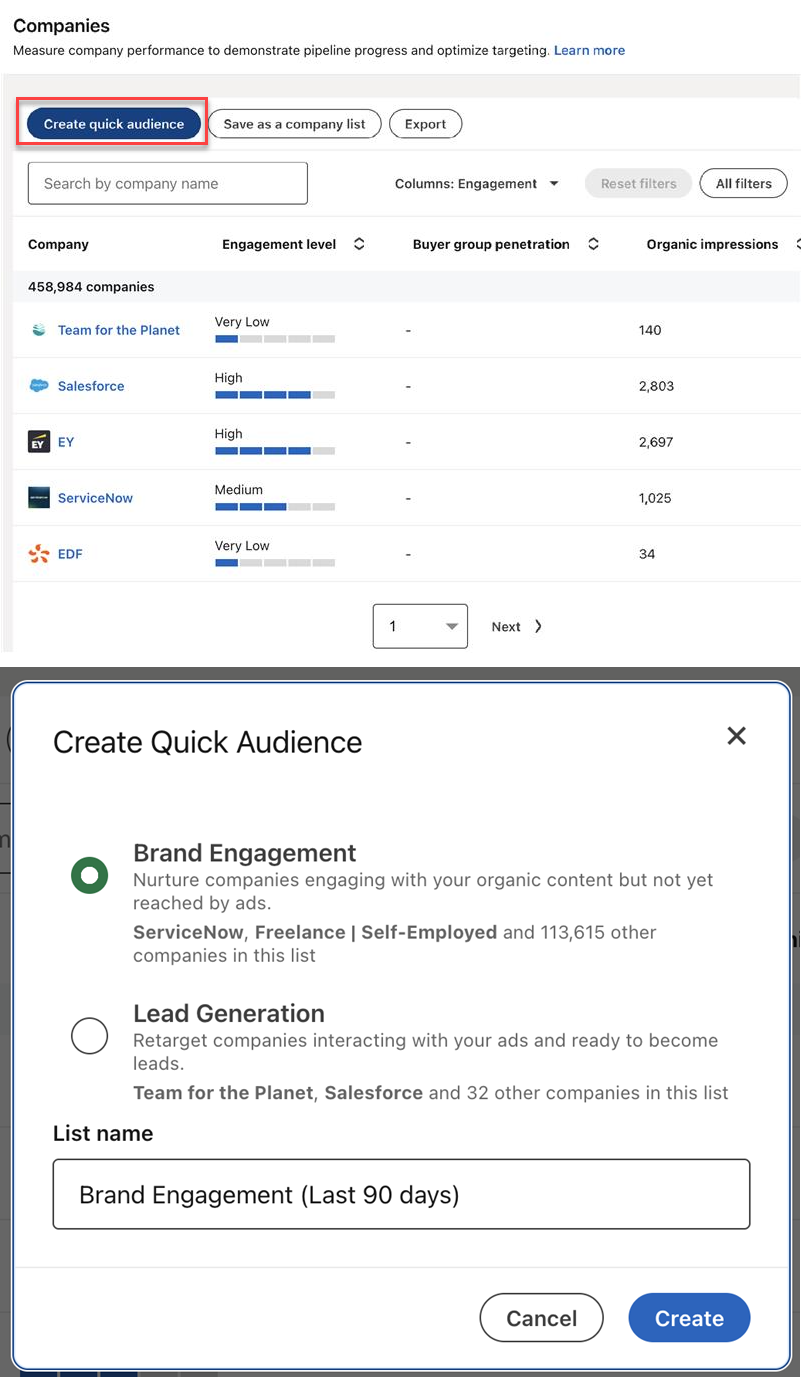 תהליך בניית קהל החברות החדש מאפשר לך להפוך חברות שהפגינו מעורבות לרשימות מוכנות לשימוש, עם אפשרויות למעורבות מותג או ליצירת לידים.